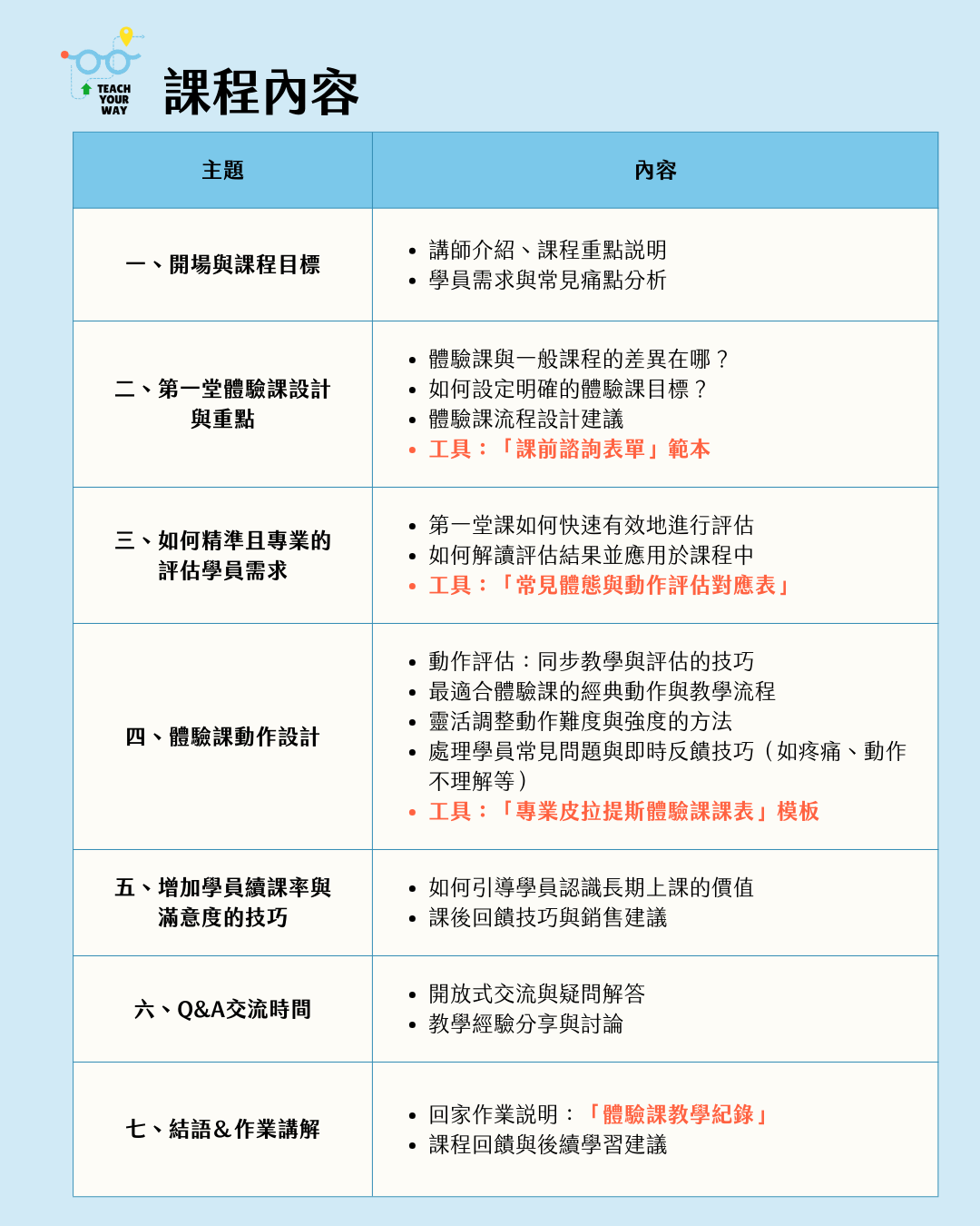 本工作坊精選實用教學策略與工具,助你在皮拉提斯教學生涯中開創成功之路。